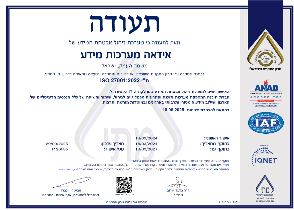 התקן מתייחס לכל היבטי אבטחת המידע בארגון ומספק מתודולוגיה סדורה לניהול מידע בצורה מבוקרת ויעילה.
